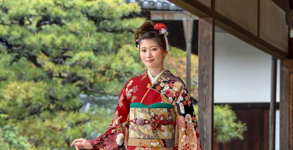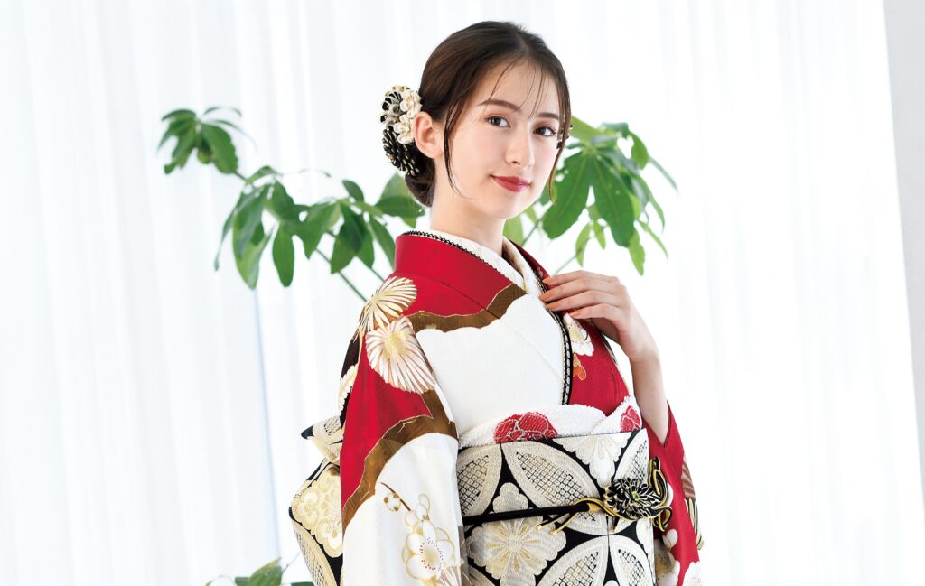 赤リップで顔色を明るくしたり、アイメイクにさりげなく赤系のニュアンスを加えたりすることで、振袖姿がぐっと引き立ちます。