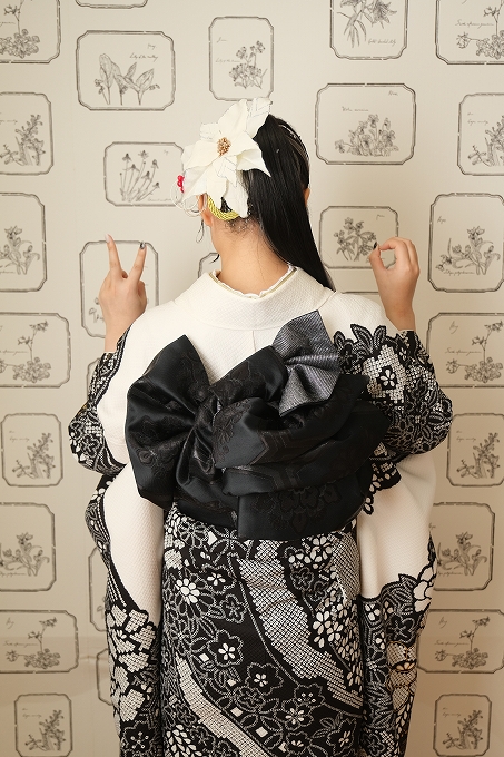 白地に絞りで黒い柄が入り、大人っぽいお着物がお嬢様にとてもお似合いでした |