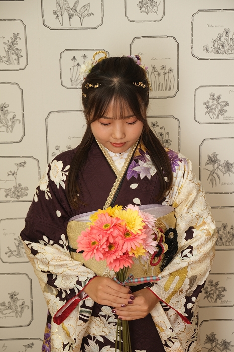 赤茶色の珍しい振袖でしたが、清楚なお嬢様に良く似合っていました |