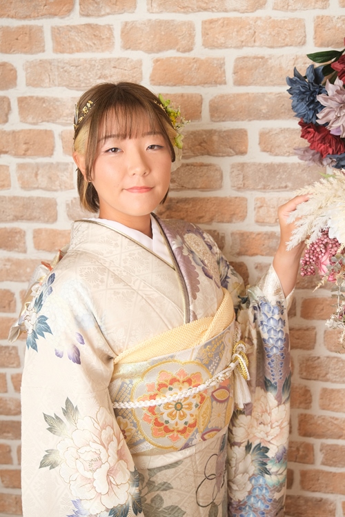 | スタッフより | 優美なニュアンスカラーで魅せる、上品で可憐な振袖スタイル 淡いクリーム色の地に、藤色や水色の草花がふんわりと描かれた振袖は、やさしい雰囲気と品格を兼ね備えた一着。落ち着いたトーンの中にも華やかさがあり、大人への第一歩にふさわしい気品を感じさせます。