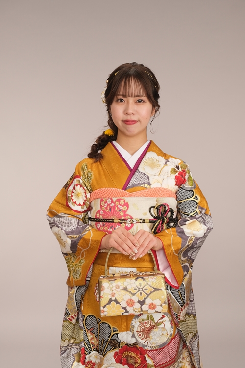 スタッフより | 華やぎと気品が共鳴する、王道古典振袖の美しさ 黄金色のように明るく艶やかなからし色に、牡丹や菊、松などの伝統文様がぎっしりと配された振袖は、まさに“晴れの日”にふさわしい一着。帯やバッグを白系でまとめ、上質な光沢と統一感が漂います。 丁寧に整えられた立ち姿には、自信と誇りがにじみ出ていて、どこから見ても美しい正統派。古典美を継承しながらも、どこか今っぽさも感じさせる装いは、家族や大切な人にとっても記念すべき一日となることでしょう。 ご成人、心よりおめでとうございます。これまでの歩みに感謝し、これからの人生を堂々と歩まれるその背中に、あたたかな祝福が降り注ぎますように。 |