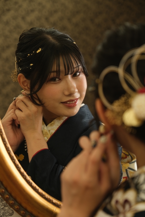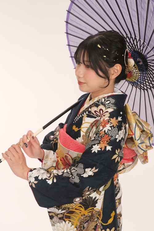 スタッフより | 上品な和の美しさを引き立てる、深紺と金のクラシカル振袖スタイル深みのある濃紺に金彩が映える、格式高い雰囲気の振袖スタイル。細やかにあしらわれた牡丹や菊の古典柄が、落ち着いたトーンの中にも華やかさを添えています。重厚感のある白金の帯に、赤の帯揚げがアクセントになり、コーディネート全体に華やぎをもたらしています。髪はすっきりとまとめ、凛とした佇まいが印象的です。大人の魅力が漂う装いで、特別な一日を優雅に彩ります。 ご成人、誠におめでとうございます。ご家族の愛に包まれて迎える大切な節目の日。新たな門出が希望と笑顔に満ちた素晴らしいものとなりますよう、心よりお祝い申し上げます。 |