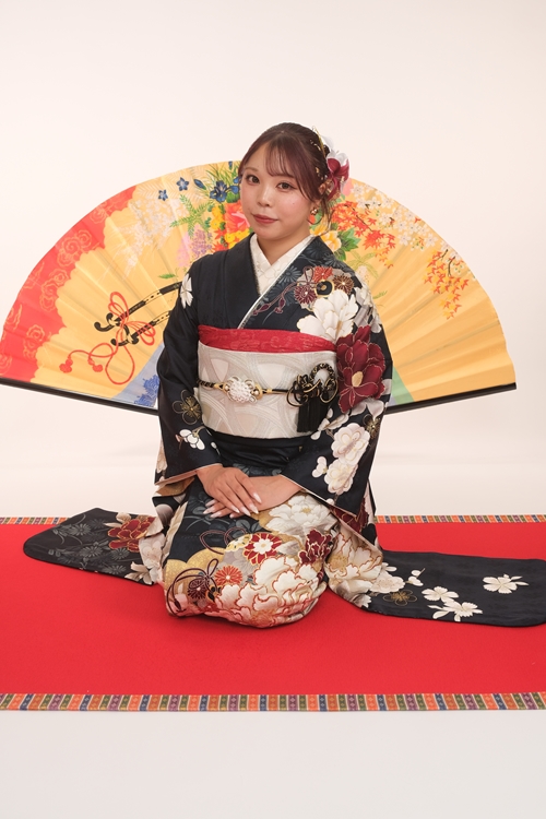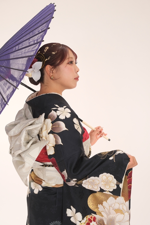 スタッフより | モダン×クラシカルな気品あふれるスタイルで魅せる、特別な晴れ姿紺地に華やかな赤花が咲き誇る振袖は、格式ある古典柄の美しさをベースに、今どきのエッセンスを絶妙に取り入れた一着。大輪の牡丹や桜が緻密に描かれ、紺・赤・ゴールドの色使いが豪華さと上品さを同時に演出しています。振袖の袖や裾にかけて流れるように配された柄ゆきは、スタイルをより美しく見せ、動きの中で花が舞うような印象を与えます。 帯には、シンプルなシルバー×金の袋帯に繊細な文様が施され、優美な変わり結びが後ろ姿を印象的に仕上げます。白のショールをすれば、成人式のお出かけスタイルが完成!赤系の髪飾りと相性もよく、全体の統一感が素晴らしいコーディネートです。 お嬢様の優しげな笑顔と、明るく清潔感のある佇まいがこの振袖にぴったりマッチし、品格と愛らしさを兼ね備えた魅力を引き立てています。ヘアスタイルはほどよく華やかにまとめられ、上品な中にも晴れの日の華やぎが感じられます。 ご成人おめでとうございますこのたびはご成人、誠におめでとうございます。 |