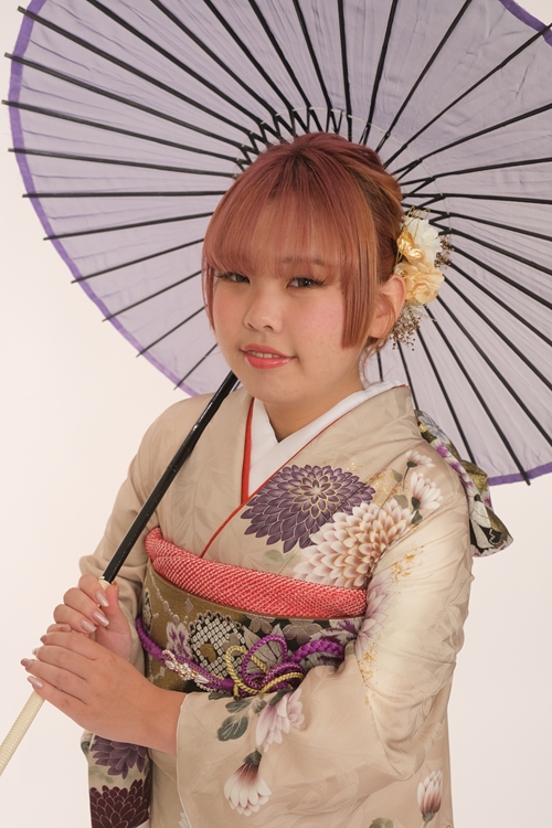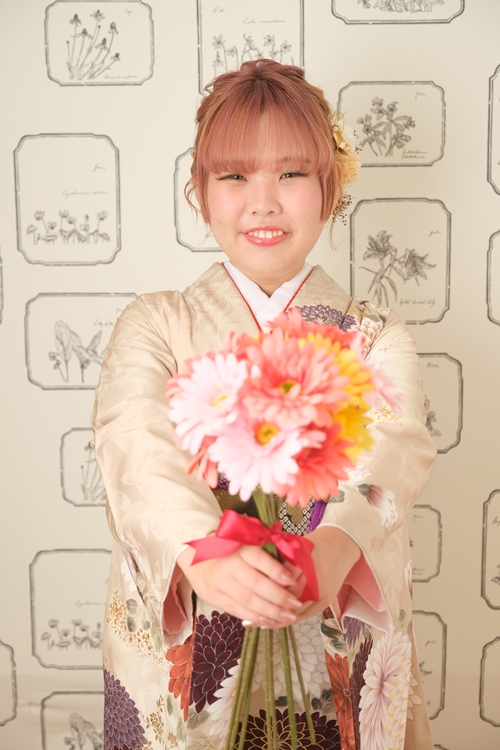 スタッフより | やわらかなベージュ地にくすみカラーの菊が咲く、上品で可憐な一着ベージュの落ち着いた地色に、くすみオレンジやパープル系の菊柄が優美に描かれた振袖は、大人っぽさと可愛らしさを兼ね備えた一着です。大輪の菊が舞うように配置された柄付けが、全体に華やかさと動き与え、メリハリのある印象に。帯や小物にはオレンジ系やゴールドを取り入れて、柔らかくまとまりのある上品なコーディネートに仕上がっています。 ふんわりとしたピンク系のヘアに、淡い色味の髪飾りを合わせたスタイリングは、優しい雰囲気を引き立て、透明感あふれるお嬢様の魅力をより一層引き出しています。ナチュラルな笑顔が印象的で、全体のやわらかさとバランスが絶妙です。 ご成人、誠におめでとうございます。人生の大きな節目となるこの日が、ご家族と共にかけがえのない思い出となりますように。これからの未来が、笑顔あふれる素晴らしい日々でありますように。 |