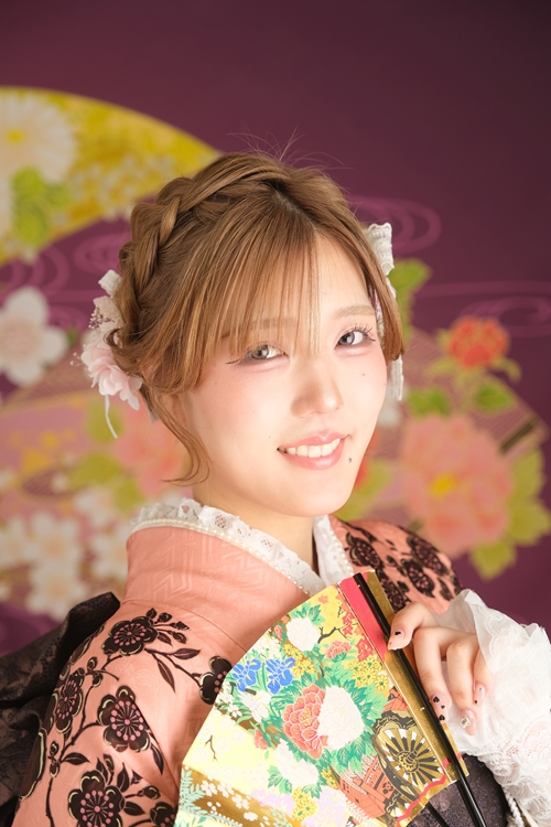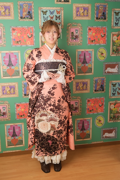 振袖スタイル | サーモンピンクに黒花が華やぐガーリー振袖スタイル |