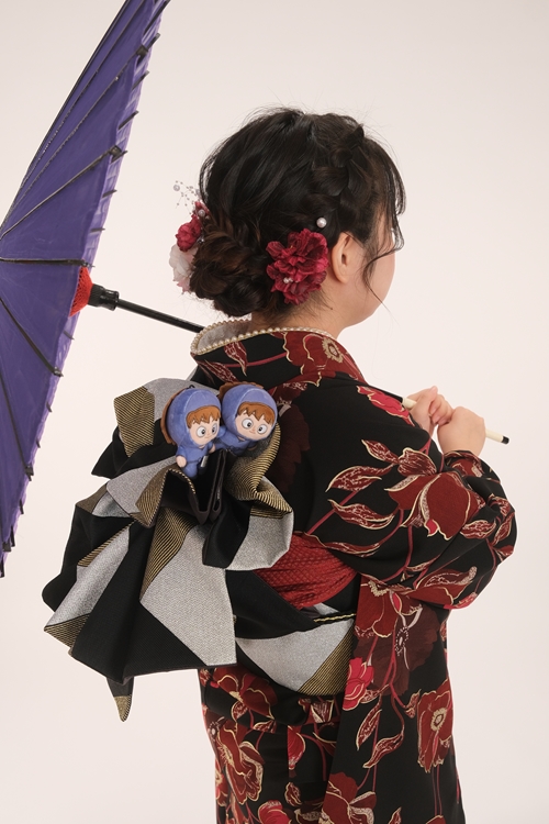 スタッフより | 個性が光る遊び心ある黒振袖コーデ黒地に深赤の大ぶりな花柄が全体に描かれた総柄の振袖は、モダンで個性的な雰囲気を演出。直線的なラインが目を引くおしゃれな帯に乗ったキュートな推しのぬいぐるみは、見る人の心をくすぐる遊び心たっぷりの写真です。レトロな柄使いと帯のポップさが絶妙にマッチし、他にはない印象的な装いに仕上がっています。 ヘアスタイルも華やかで、赤と白の髪飾りが後ろ姿をより美しく彩り、お嬢様の可憐で柔らかな笑顔にぴったり。全身から自分らしさとセンスがあふれる、特別な晴れの日の装いです。