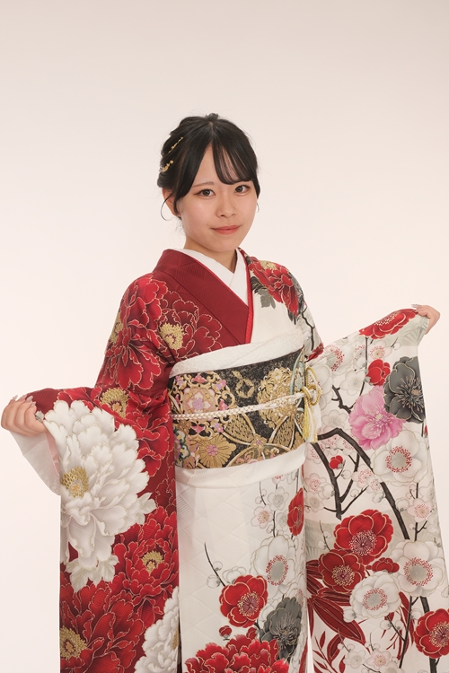 艶やかな赤と清楚な白を大胆に切り替えたデザインに、金彩が上品に施されたスタイリッシュな振袖です。裾に向かって咲き誇る大輪の梅や牡丹が、成人の日にふさわしい華やかさを演出。ゴールドの袋帯には繊細な文様が織り込まれ、帯揚げや帯締めの白が爽やかにコーディネートを仕上げています。深めの赤の地色が肌を美しく引き立ててくれます。王道でありながらモダンな印象も持ち合わせ、家族や友人からも「素敵だね」と声をかけられること間違いなしの一着。お祝いの晴れ姿を、上品に、華やかに彩ってくれます。