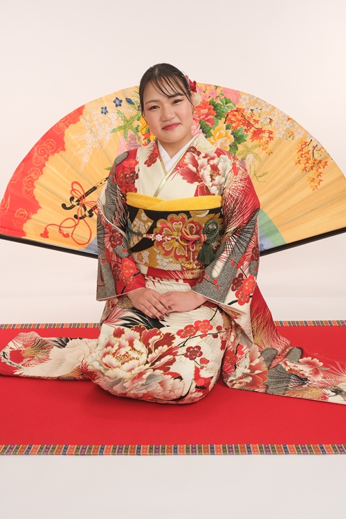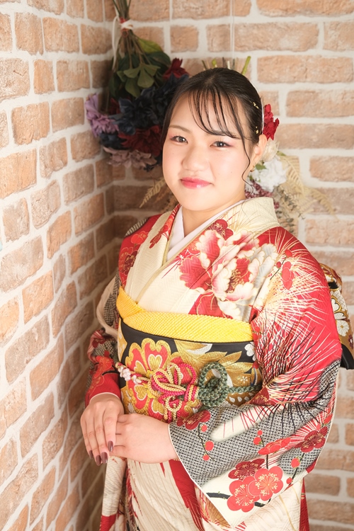白地に松や牡丹が咲き誇り鶴が舞う振袖は、まさに「大人かわいい」を体現した一着。肩から袖にかけての流れるような赤の柄が華やかで、圧倒的な存在感のある振袖です。 黄色の帯揚げが差し色になり、その明るい色味がフレッシュな印象を添えています。髪飾りには白と赤の花がバランスよくあしらわれ、和の美しさと愛らしさを両立。上品でありながら力強さも感じさせるこの装いは、晴れの日の主役にふさわしい輝きを放ちます。