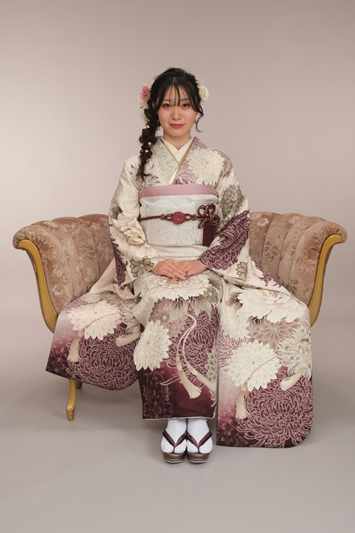 上品なスモーキーモーヴのピンク色と、アイボリーのグラデーションが美しい振袖は、大輪の菊や松の文様が華やかに咲き誇り、落ち着きのある華やかさを演出します。シックなトーンの中にも立体感のある刺繍や細部の装飾が映え、凛とした美しさが際立つ一着です。 帯や小物にはボルドーやくすみピンクを効かせて、大人っぽさと可憐さのバランスが絶妙。サイドの編み下ろしヘアに飾られたお花の髪飾りも、全体の雰囲気をより一層引き立てて素敵ですね!