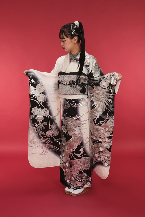 大胆な黒と白のグラデーションに、ドラゴンの柄が大胆に描かれた個性派振袖。きらりと光る銀彩やスワロフスキーの輝きが、都会的で洗練された印象を添えています。白地に映える黒のアクセントが、凛とした大人の美しさを引き立てつつ、スタイリッシュでモード感のある装いに仕上がっています。