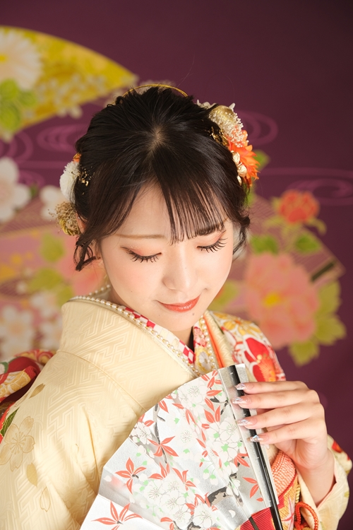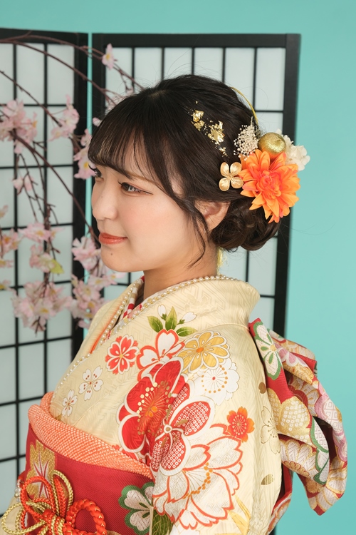 柔らかなクリームイエローの振袖に、赤やオレンジの花々が可憐に咲き誇る一着。明るくやわらかな色合いがお嬢様の透明感を引き立て、ふんわりとした幸福感に包まれたようなコーディネートです。 帯には鮮やかな朱赤を合わせ、メリハリのある美しいシルエットを演出。重ね衿や帯締めの華やかなオレンジの彩りが、上品さの中にほどよい可愛らしさを添えています。落ち着いたシニヨンのまとめ髪に、振袖のカラーに合わせたオレンジの髪飾りが優しく寄り添い、ナチュラルで大人っぽい雰囲気がとても素敵です。