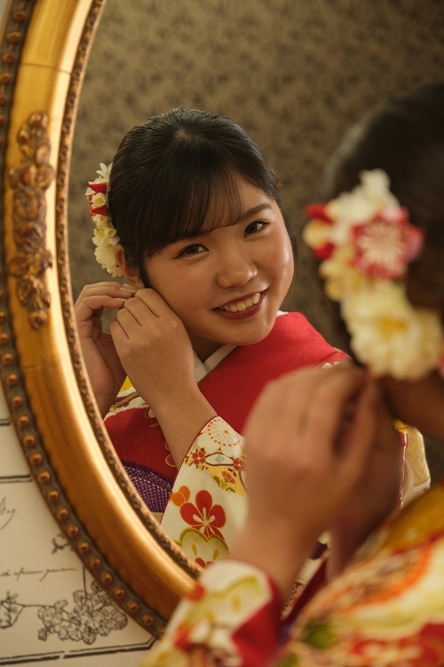 華やかな赤地に、可憐な花々がふんだんにあしらわれた振袖は、晴れの日らしい高揚感と上品さをあわせ持つ一着。金彩のきらめきが全体に奥行きを与え、重ね衿や帯まわりの色合わせが顔映りをぱっと明るく見せてくれます。金のすっきりとした大柄の帯を合わせ、振袖の柄と合わせた小物合わせは細部まで丁寧に整えられており、派手すぎず、それでいてしっかりと華やか。 きっちりとまとめたシニヨンのヘアスタイルに添えた髪飾りも振袖の色柄と美しく調和し、やさしく穏やかな表情をより魅力的に引き立てています。自然な微笑みから伝わるあたたかさが、振袖の華やぎと重なり、見る人の心まで明るくしてくれるような一枚です。