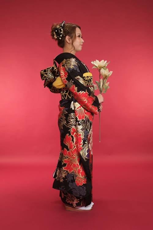 | 振袖スタイル | 黒地に赤金が映えてかっこいい!大人気のモダン振袖 |