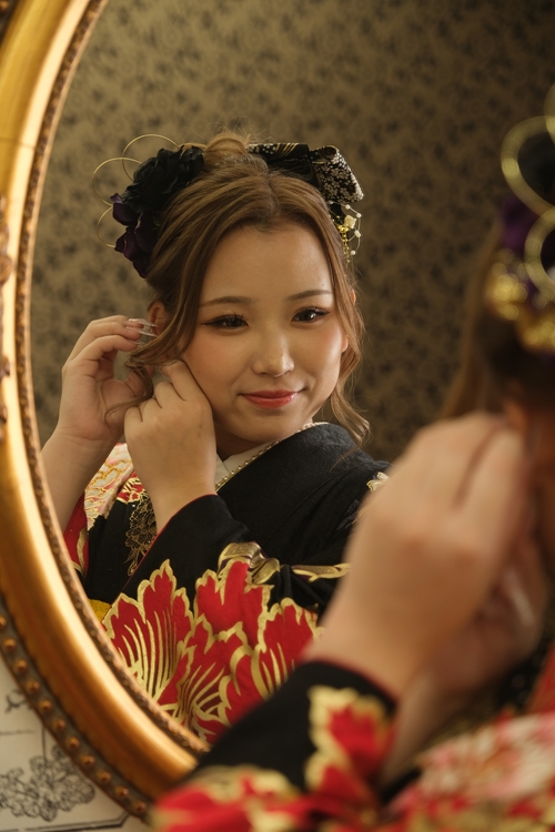 艶やかな黒地に、赤や金の花々が贅沢に咲き誇る振袖は、晴れの日にふさわしい存在感あふれるモダンな一着。大柄の力強さと華やかさが際立ち、写真全体にお祝いの空気を運んでくれます。豪華な小物使いも印象的で、コーディネートに深みと格調高さをプラス。何より、ご家族と寄り添う姿がとても温かく、振袖の美しさに負けない“幸せな雰囲気”が画面いっぱいに広がっています。笑顔の中に感じられる安心感と絆が、この一日がかけがえのない時間であることを物語っています。