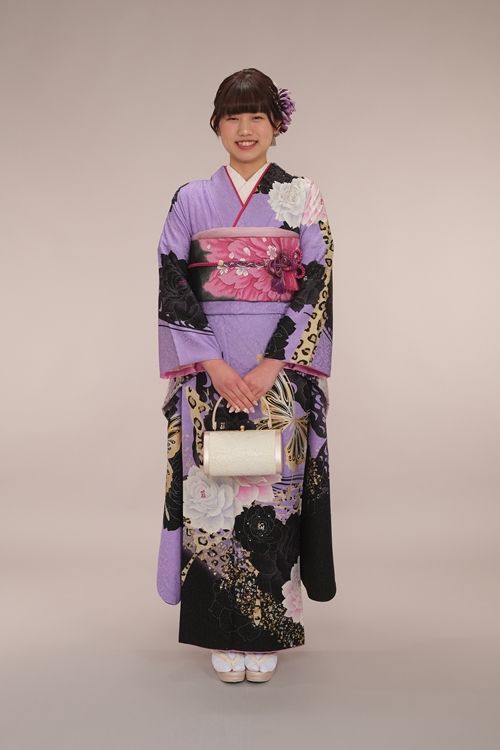 艶やかな紫を基調に、黒と白の薔薇が重なり合う振袖は、華やぎと煌びやかなオーラを兼ね備えた大人っぽい一着。色のコントラストが美しく、ヒョウ柄のアクセントが縦のラインをすっきりと見せてくれるため、立ち姿がとても凛とした印象に映ります。 帯にはやわらかなピンクを合わせ、重くなりがちな配色にほどよい可愛らしさをプラス。胸元や小物の色合わせも丁寧で、全体に統一感のある上品なコーディネートに仕上がっています。控えめなヘアスタイルとナチュラルな表情が振袖の雰囲気とよく調和し、お嬢様の穏やかな魅力を引き立てています。