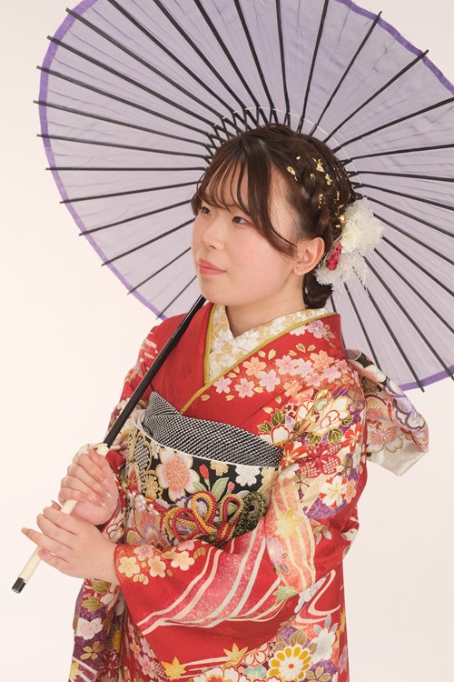華やかな赤地に、金彩と多彩な花々が繊細に描かれた古典振袖は、格式と華やぎを兼ね備えた一着。細やかな文様が全体に奥行きを与え、どの角度から見ても美しさが際立ちます。シルバー帯が全体を華やかに盛り立て、黒の絞りの帯揚げで上品にまとめた絶妙なコーディネート。きちっと感のある着付けとスタイリングも印象的で、凛とした横顔と相まって、まるで一枚の絵のような美しさを感じさせます。ゆるふわのシニヨンも振袖と見事に調和し、可憐さと大人っぽさを兼ね備えた仕上がりです。 落ち着いた表情としなやかな所作からは、芯のある美しさとやさしさが伝わり、振袖の魅力をより一層引き立てています。伝統美をしっかりと自分らしく着こなしている姿が、とても印象的です。