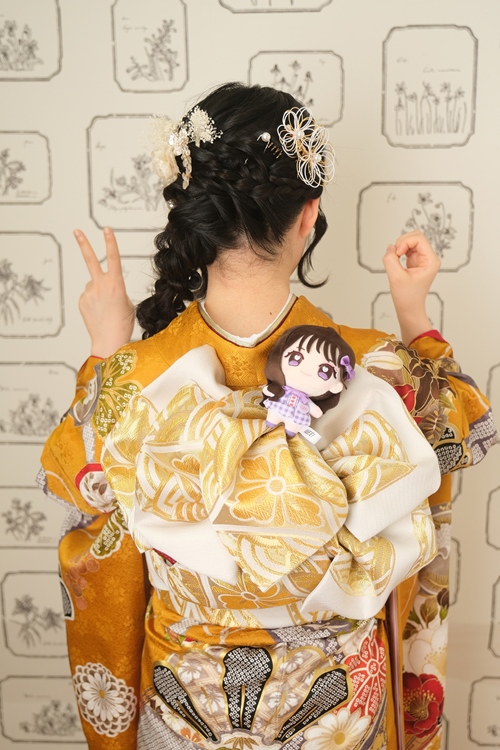 あたたかみのある山吹色に、赤や白の花々がリズミカルに広がる振袖は、レトロな可愛らしさと今っぽさが絶妙にミックスされた一着。大胆な柄行きが目を引きつつ、帯まわりの落ち着いた白の配色が全体を上品にまとめ、バランスの良いコーディネートに仕上がっています。