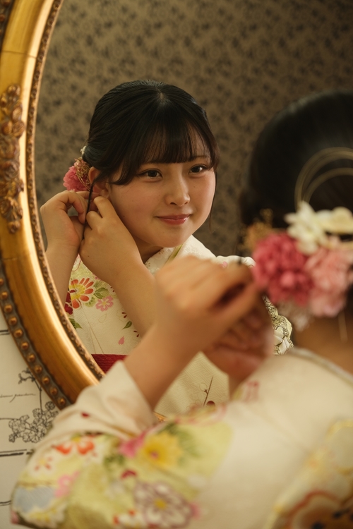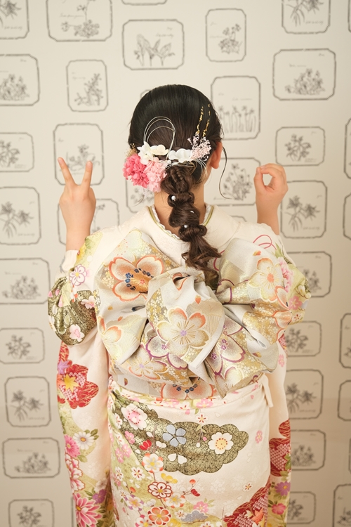 | スタッフより | ふんわり華やぐ振袖姿、可憐な令和ハタチの振袖コーデやわらかな白地に、淡い花々が優しく広がる古典振袖は、可憐さと今っぽさを兼ね備えた一着。背中に結ばれた大きなリボンの帯が目を引き、まるでドレスのような華やかさを演出しています。 繊細な色使いで着物と同色の帯合わせが今っぽいコーディネート。やわらかな雰囲気と華やぎをMIXした上品な晴れ姿です。 ゆるく編み込まれたロングのヘアスタイルにパール調の髪飾りを添えたアレンジもとても可愛らしく、全体のやわらかな雰囲気と見事にマッチしています。振袖の上品さとトレンド感が融合した、今どきの魅力あふれるスタイルです。 後ろ姿からも伝わる丁寧な着こなしと、お嬢様らしいやさしい雰囲気がとても印象的。振袖の魅力をしっかりと引き出しながら、自分らしさも大切にしている姿が本当に素敵です。 ご成人、誠におめでとうございます。今日という特別な一日が、これまでの思い出とともに、これからの未来へとつながる大切な節目となりますように。振袖に咲く花々のように、これからの人生が優しく華やかに彩られていきますことを、心よりお祝い申し上げます。 |