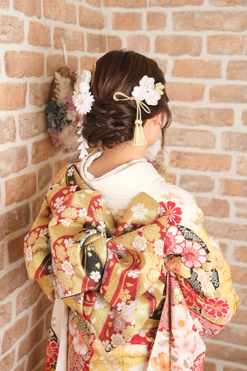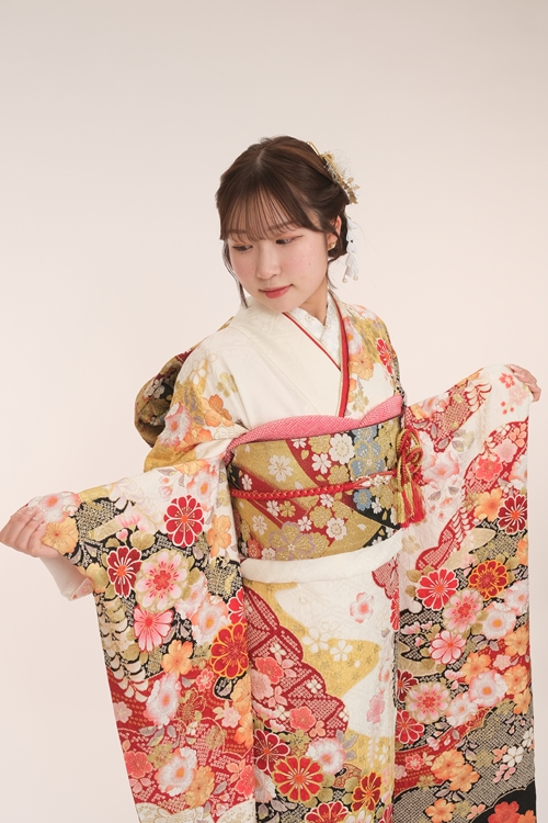 清らかな白地に、赤やピンクの花々がふんわりと咲き広がる振袖は、豪華で上品さを兼ね備えた絞りの一着。やさしい色合いの中に華やかさがしっかりとあり、晴れの日にふさわしい柔らかな存在感を放っています。 帯には温かみのある金を合わせ、全体にほどよいアクセントをプラス。広げた袖いっぱいに広がる花柄がとても美しく、動きのあるシルエットが印象的です。すっきりとまとめたシニヨンのヘアスタイルと控えめな髪飾りも振袖の雰囲気とよく調和し、落ち着いた中に可愛らしさが感じられるコーディネートに仕上がっています。 しとやかな表情とやわらかな所作からは、優しさと芯の強さが感じられ、振袖の魅力を自然体で引き出している姿がとても素敵です。大人への一歩を踏み出した今だからこそ似合う、上品で美しい晴れ姿ですね。