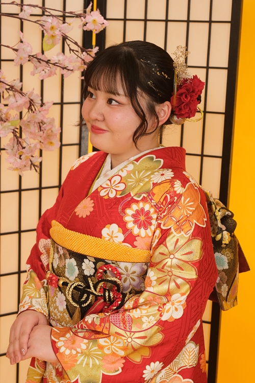 | スタッフより | 華やぎの赤、やさしく彩る上品レトロな振袖華やかな赤に、やわらかな四季の花々が優雅に咲き広がる振袖は、可憐さと落ち着きを兼ね備えた一着。鮮やかさの中にやさしさを感じる色使いが、お嬢様の柔らかな雰囲気をより一層引き立てています。裾の黒が全体を凛と引き締めながらも、かわいい印象に。 帯には深みのある黒を合わせ、帯揚げと帯締めの山吹色と赤色を効かせました。手元のバッグや小物づかいも丁寧に揃えられ、細部まで美しさが行き届いています。すっきりとした立ち姿と自然な笑顔が振袖の華やぎと調和し、とても印象的な晴れ姿です。 やさしい表情の中に、しっかりとした芯の強さが感じられ、振袖の魅力を自然体で引き出している姿がとても素敵です。華やかさと落ち着きのバランスが絶妙で、大人への一歩を感じさせる美しい装いですね。 ご成人、誠におめでとうございます。今日という特別な一日が、これまでの大切な時間とともに、これからの未来へとつながる素晴らしい節目となりますように。振袖に咲く花々のように、これからの人生がやさしく華やかに彩られていきますことを、心よりお祝い申し上げます。 |