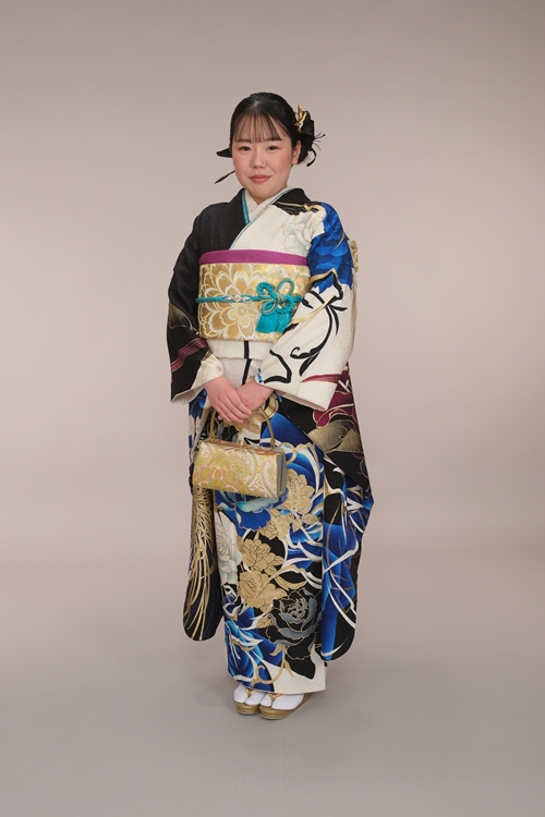白地に鮮やかなブルーローズとブラックの柄が大胆に描かれた振袖は、まるでアートのような存在感を放つ一着。流れるようなラインとダイナミックな色使いが印象的で、動きのあるシルエットがとても美しく映えます。帯にはすっきりとした明るいゴールドを合わせることで、華やかな柄を引き立てつつ、全体を上品にまとめた絶妙なコーディネートに。手元のバッグや小物づかいも統一感があり、細部まで洗練された仕上がりです。すっきりとした立ち姿と落ち着いた表情が振袖のクールな魅力とよく調和し、凛とした美しさが際立っています。