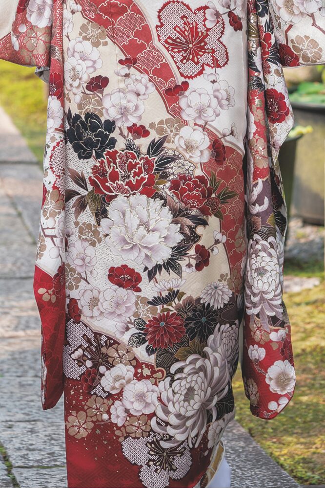 白地に咲く赤・黒・白の牡丹柄が華やかな古典振袖|小花柄/低身長さんにもおすすめ