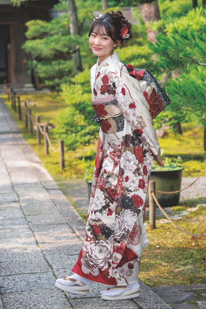 清楚な白地に、鮮やかな赤牡丹が咲き誇る上品な古典振袖。華やかさの中にもやりすぎない落ち着きを感じる色使いで、気品ある印象を引き立てます。帯には黒の差し色を加え、全体を引き締めたコーディネートが魅力。
