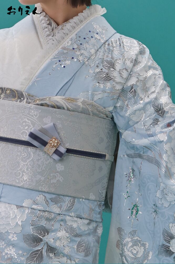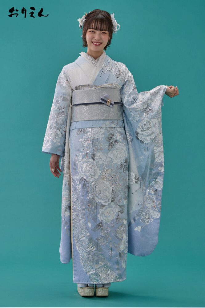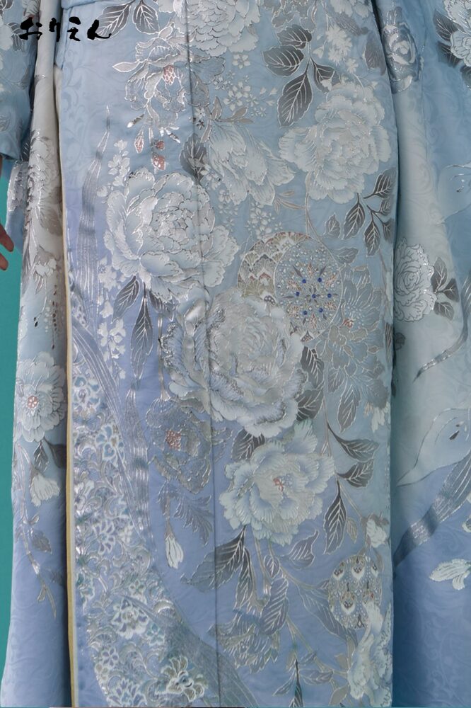 淡い水色と白のグラデーションが美しい地色に、銀彩のバラが咲き誇るエレガントな振袖。繊細なぼかしのグラデーションが透明感を引き立て、スワロフスキーがふんだんに輝くこの一着は、豪華で清らかな印象を与えます。