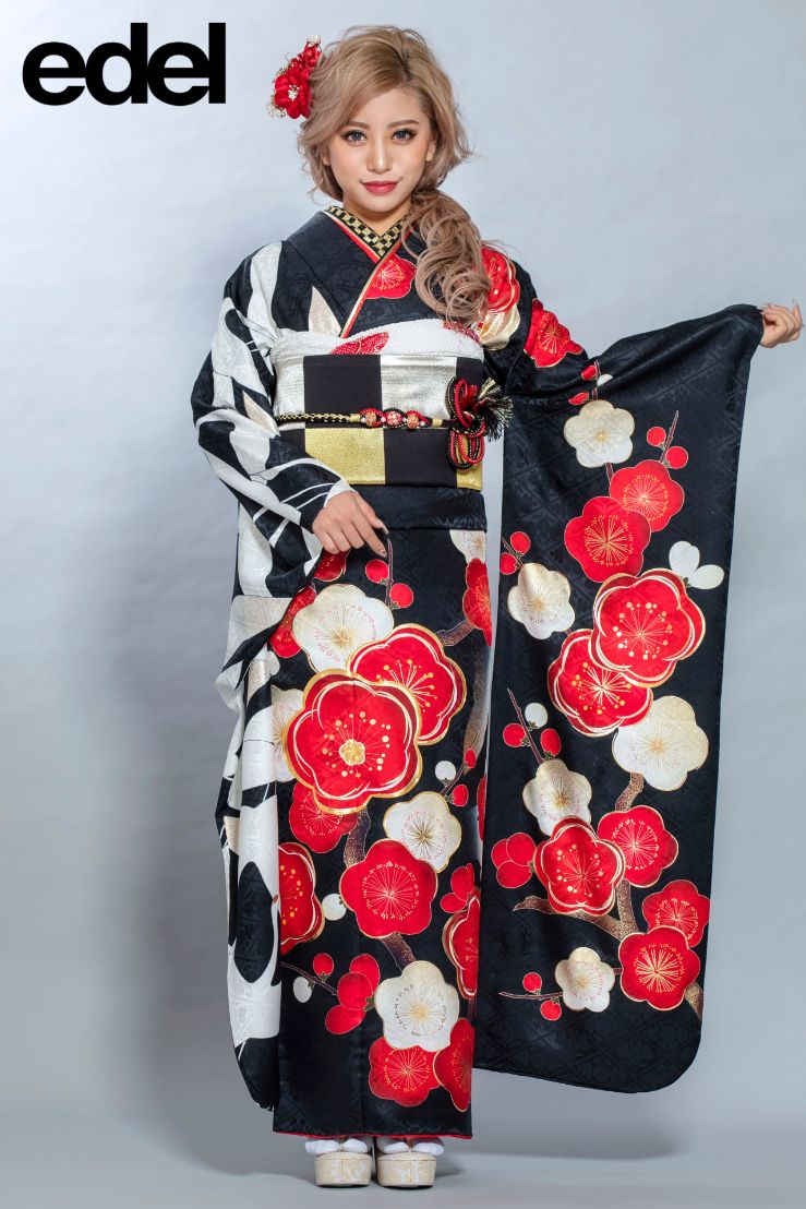 黒地に大胆に描かれた赤と白の梅が印象的なレトロ振袖です。大きな花柄と鶴の独特のデザインに加えて、市松模様の帯を合わせ、伝統とモダンが見事に融合したスタイルを楽しめます。赤の華やかさと黒の重厚感、白の清楚さが絶妙なバランスを生み出し、成人式の舞台で存在感を放ちます。個性を大切にしながらも格式を感じさせる一着は、他にはないレトロモダンな雰囲気を求める方にぴったりです。