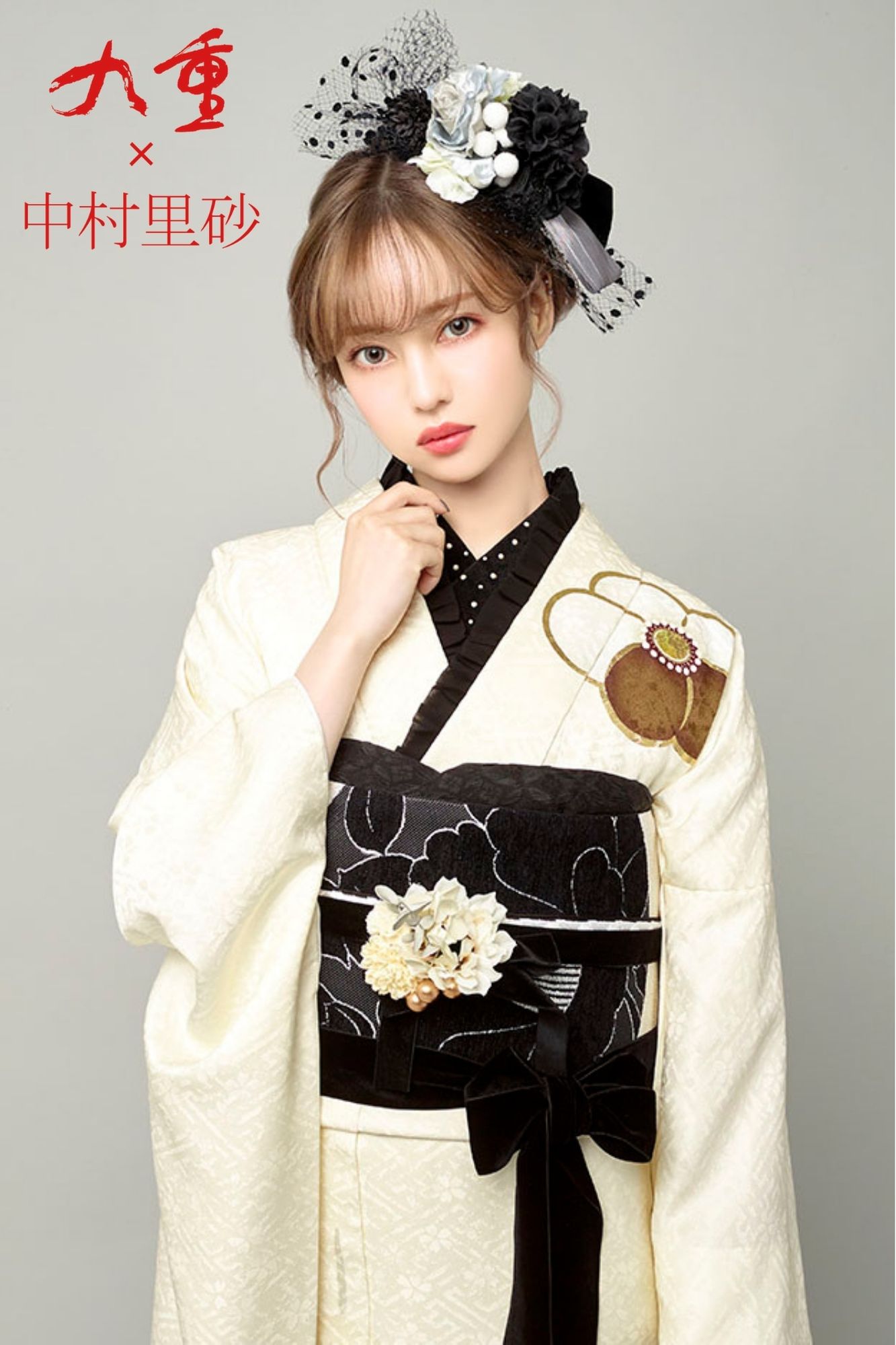 九重×中村里砂 オフホワイトのシンプル白振袖に咲く大輪のレトロ梅柄